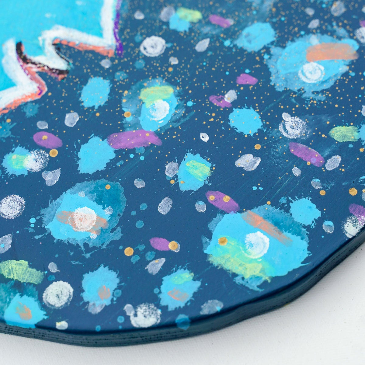 Mixed media on hand-cut marine plywood, signed on the back and ready to hang.