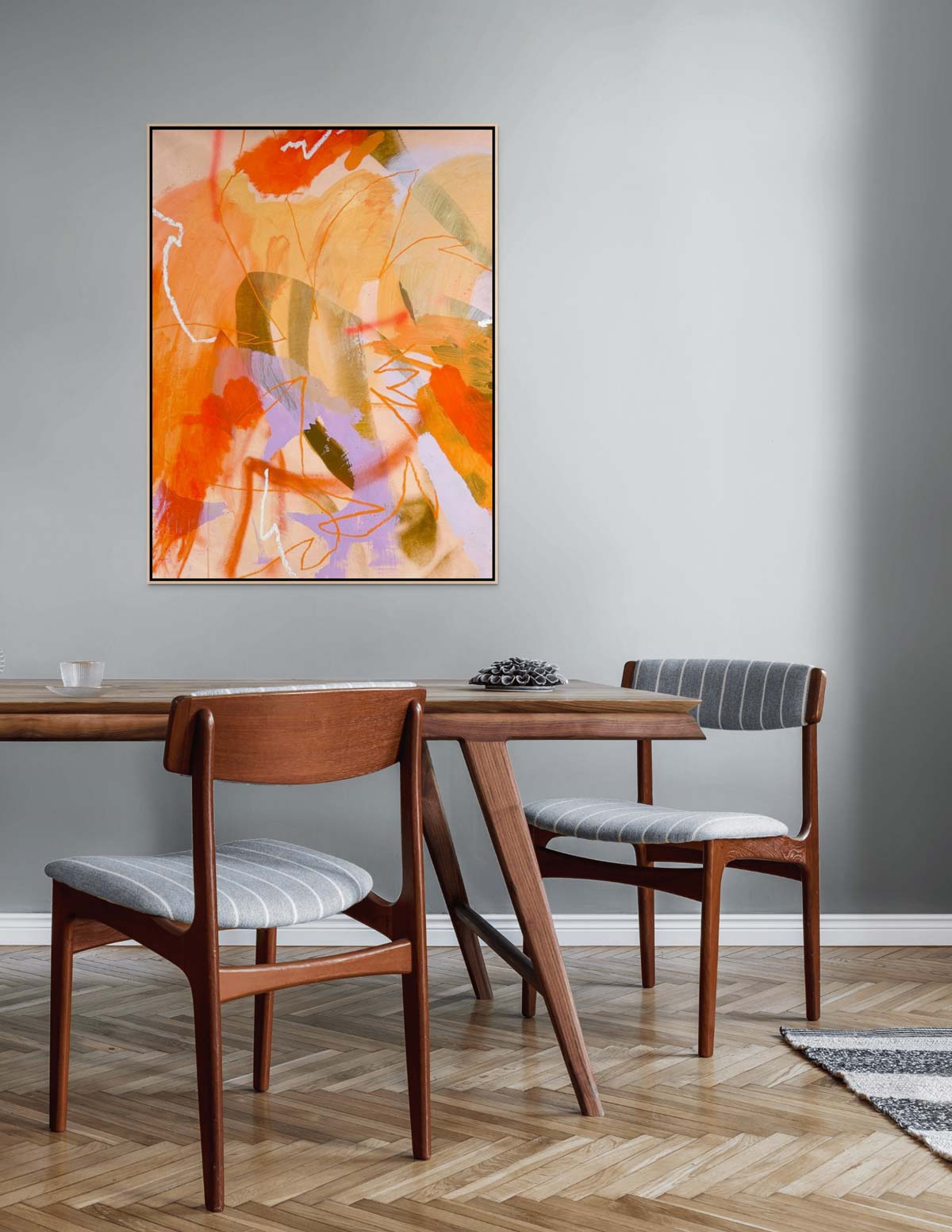 Original canvas paintings are float framed in 1cm wide by 5cm deep oak frames, finished in either oak, black or white depending on the piece.